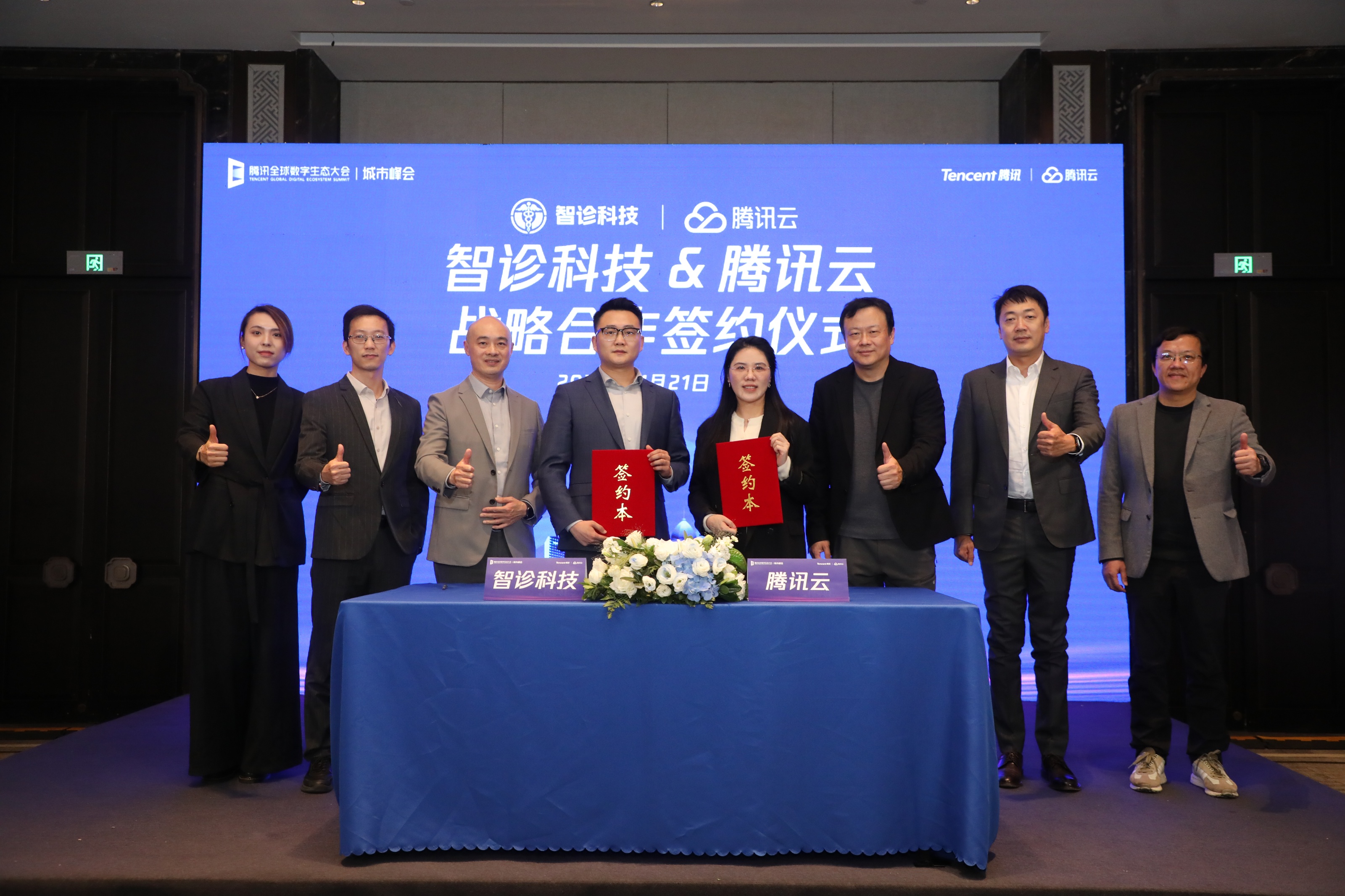 在智诊科技首席运营官王锋,腾讯云副总裁、产业生态合作业务负责人杨晨,智诊科技产品总监罗龙生,腾讯云渠道售前总经理尹晟宇,腾讯云东区渠道总经理徐泳泽等的共同见证下,智诊科技市场总监惠靖博与腾讯云东区渠道总监尤仙仙代表双方签署战略合作协议。