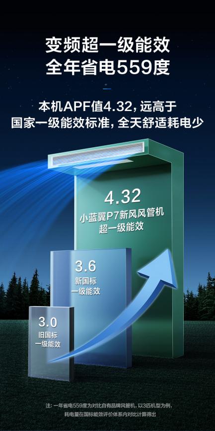 针对用户关注的能耗问题,小蓝翼 P7 新风风管机以AI 省电功能给出最优解。其 AI 大数据模型算法 2.0 可智能学习用户使用习惯,动态调节运行参数,制冷制热均能实现至高省电 40%;配合变频超一级能效(APF 值 4.32,远超国家一级能效标准 3.6),按全年使用周期计算,相比普通空调可省电 559 度,在践行绿色节能理念的同时,也为用户省下可观电费。