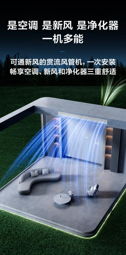 传统风管机无新风功能,空调专注温度调节,净化器被动防御污染物,而小蓝翼P7新风风管机的新风净化功能,用可通新风的贯流风管机,将空调、新风、净化器三者能力融合为一,一机多能,直击用户对“健康空气”的核心诉求。