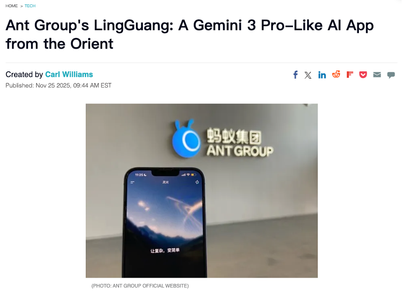 Tech Times在报道中指出,发布仅六天后,蚂蚁集团的灵光就吸引了超过200万次下载一一证明中国首款多模态AI助手并非昙花一现。“有趣的是,这很可能只是巧合,谷歌在同一天稍晚些时候发布了其多模态Gemini3 Pro。”
