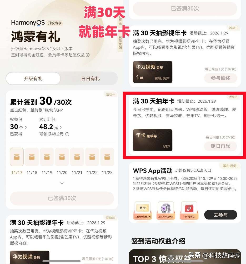 说真的,华为这波“鸿蒙有礼”给得太实在了。如果你也是华为手机用户,赶紧看看能不能升鸿蒙5.1及以上版本。升级后,在桌面右滑到“负一屏”,就能到鸿蒙有礼签到参与。最重要的是,首次签到30天后,记得回去抽那个年卡!