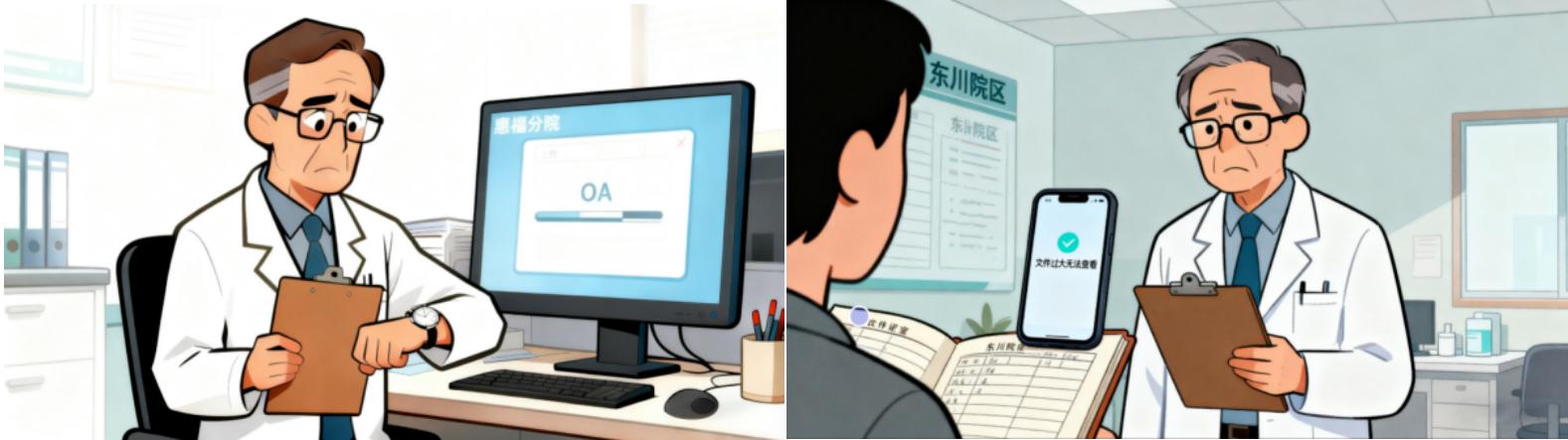 肿瘤内科的马主任经常需要往返于两个院区之间进行出诊和办公。每次跨院区前,他都会提前将可能需要的数据上传至OA系统,以便后续通过手机查阅。但手机屏幕太小,查阅资料十分不便,再加上OA系统对文件大小有限制,一些较大的数据文件根本无法随身携带。这导致他在跨院办公时常常无法及时获取所需资料,影响了工作效率。