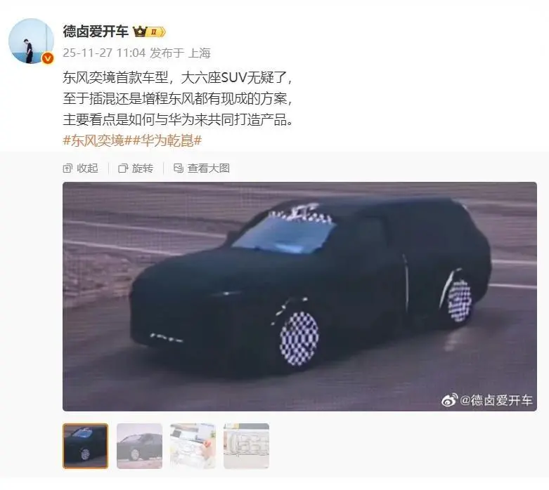 11 月 27 日消息,东风华为合作品牌“奕境”首车将在明年亮相,博主 @德卤爱开车 今日晒出汽车伪装图,表示该车为大六座 SUV。