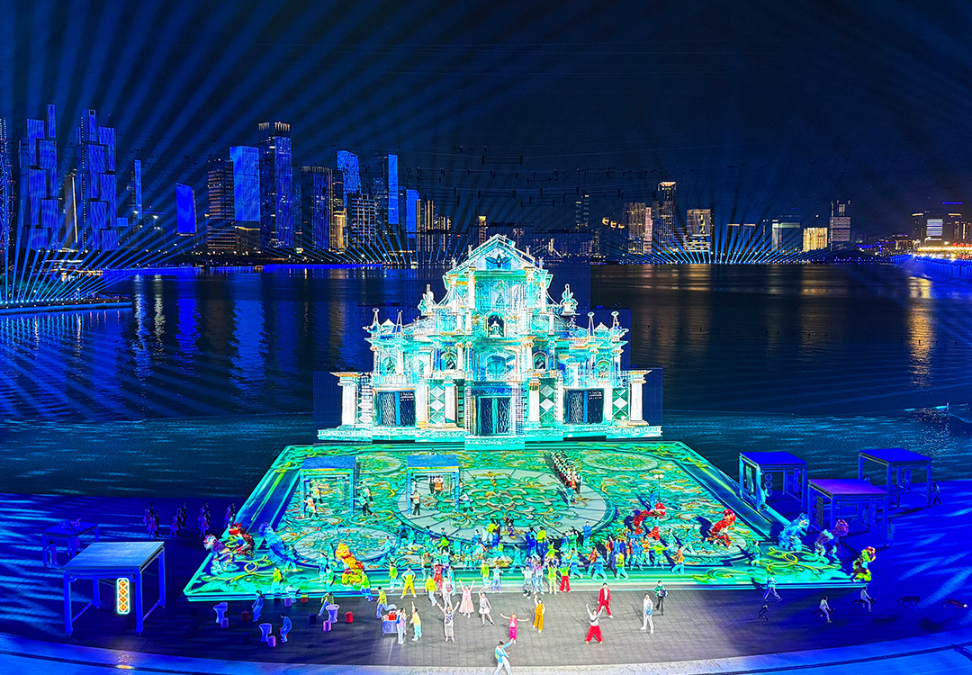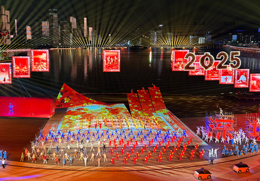 本次闭幕式在全运会历史上具有里程碑意义,首次在滨海实景场地举行,以海天为幕,城市为景,将港湾、跨海大桥、高楼建筑融入演出场域,更显气魄宏大,成为全球首个“城市全景闭幕式”。