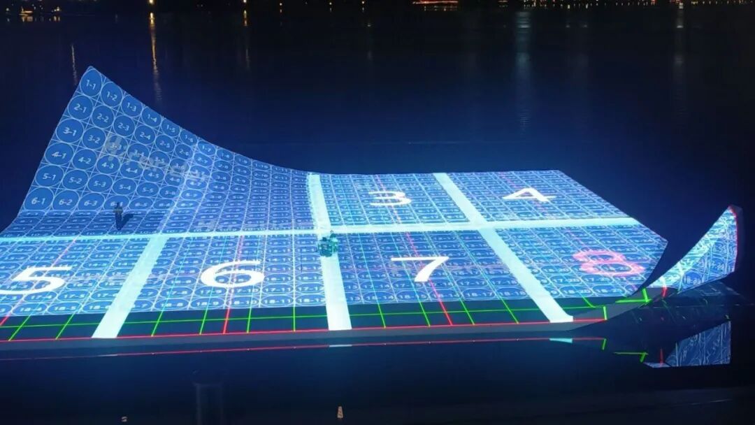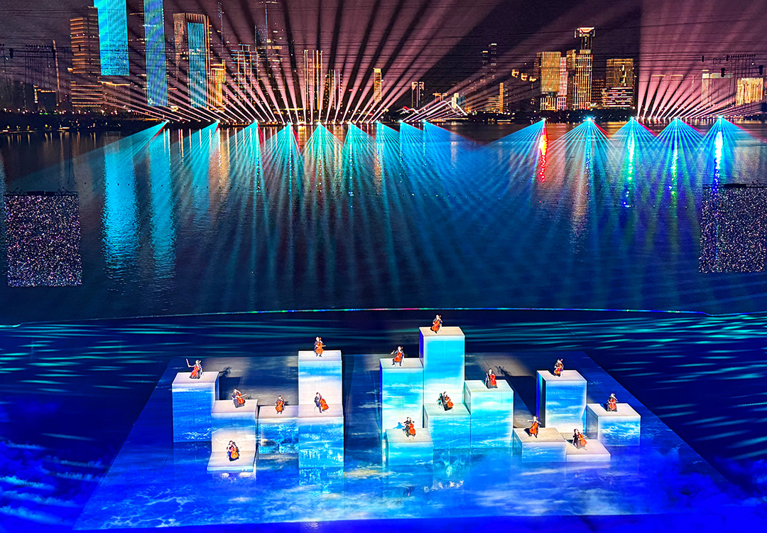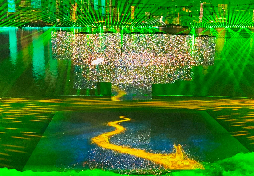 本次项目共部署78台巴可UDX-4K40,其中,54台部署于舞台正面位置,投射面积达40米x40米的完整舞台地面影像。两侧分别部署了12台进行侧面补光,在舞台“卷角”与“积木”升起时的立面上覆盖动感影像,使整个水中“纸舞台”的视觉效果浑然一体。巴可UDX-4K40亮度高达43000流明,凭借业界领先的宽色域和红色表现力,精准还原了代表民族精神的“中国红”以及歌舞表演中丰富的色彩。