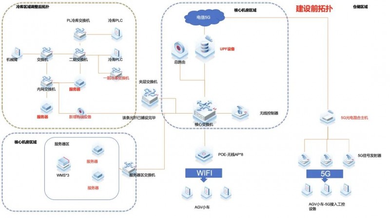 高新惠诚的老厂区早已实现高度自动化:智能叉车搬取材料、AGV小车穿梭往返,PLC控制器精准调度出货口,机械臂在冷库中灵活抓取原料,实现了从配料、制作到产品出入库等环节的全流程自动化。然而,老旧的网络会时不时的制造一些“麻烦”。