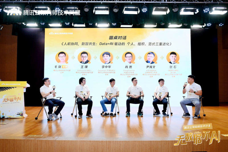 活动最后,来到精彩的圆桌对话环节。在腾讯云架构师技术同盟主席 毛剑的主持下,围绕 “人机协同,数智共生:Data+AI 驱动的个人、组织、范式三重进化”主题,DatenLord 创始人、腾讯云架构师成都同盟理事长 王璞,Easystack 开源负责人、腾讯云架构师成都同盟理事 李中华,Thoughtworks 中国区总经理、腾讯云架构师成都同盟理事 肖然,中亦安图科技品牌影响力专家、腾讯云架构师成都同盟理事 尹海文,禅道软件集团副总裁、腾讯云架构师成都同盟理事 张石,多角度探讨 AI 时代下开发者能力、组织形态、技术范式的协同进化,真诚分享自身经历与深刻思考,为与会者带来启发。