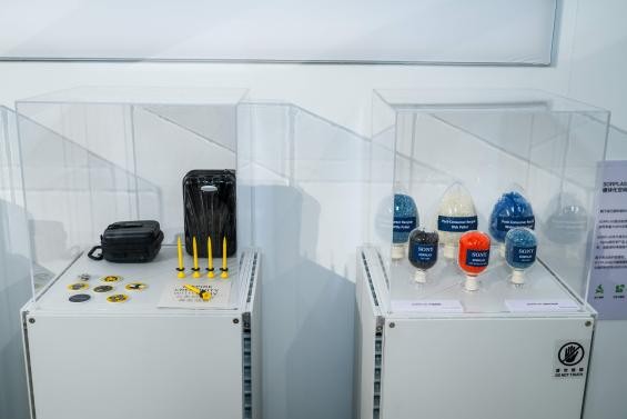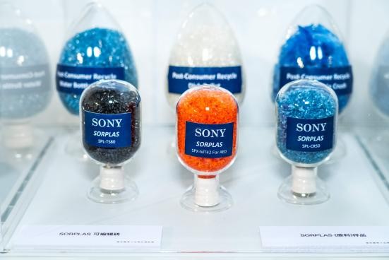 本次展览特别设立“SORPLAS环保材料专区”,展示索尼在可持续发展领域的技术创新成果。专区通过展板与实物样品,向观众介绍索尼自主研发的阻燃再生塑料SORPLAS™。该材料以废旧水桶、光盘等聚碳酸酯回收料为基础,搭配索尼自研的磺系阻燃剂配制而成,循环利用率可达95%—99%。与传统阻燃塑料相比,SORPLAS的生产过程可减少约72%的CO₂排放,同时在耐热性、强度与耐候性方面保持与原生塑料相当甚至更佳的表现。