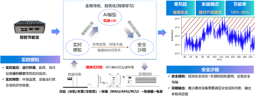 依托“鲸智节能宝”的核心AI节能算法,持续学习设备运行特征与能耗之间的复杂关系,精准挖掘能耗优化空间,通过提前预判末端负荷需求、动态下发最优调控指令,在严格保障末端环境温度达标、空调系统安全运行的前提下,实现节能率10%以上(预计15%+),形成可量化、可追溯的绿色效益。