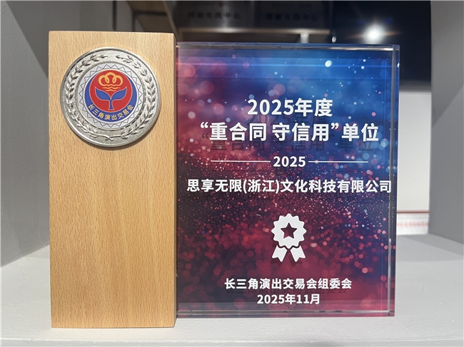 凭借长期恪守的商业信誉与规范的合同管理体系,思享无限荣获长三角“2025年度‘重合同、守信用’单位”称号。此项荣誉,是长三角演出交易会组委会对思享无限在诚信经营、履约守信方面所做努力的高度认可与肯定。