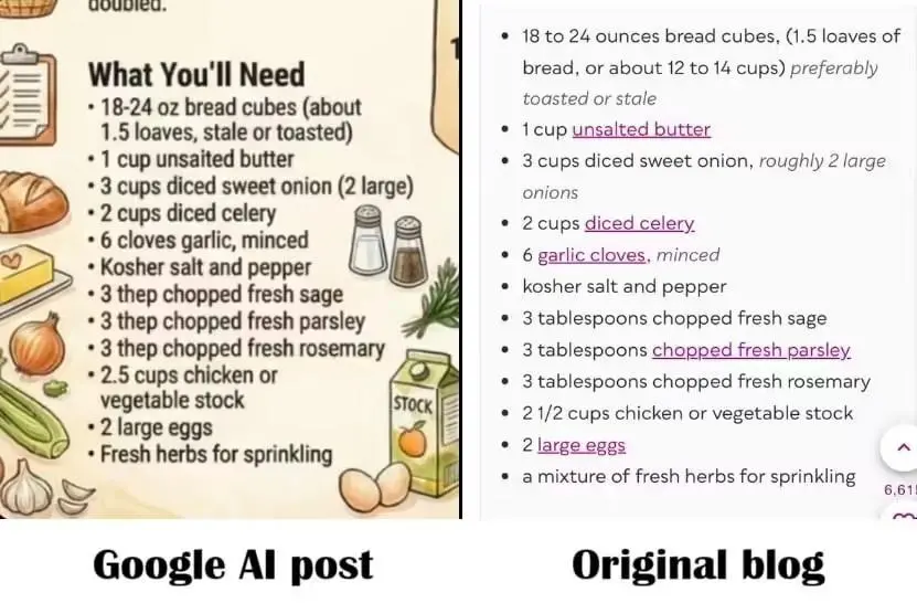 X 用户 Nate Hake 率先发现了这一问题。他将谷歌发布的 AI 信息图与美食博客 HowSweetEats 上的一篇旧文进行了详细比对。结果显示,AI 生成的配料表和制作结构与原博客内容惊人地一致。