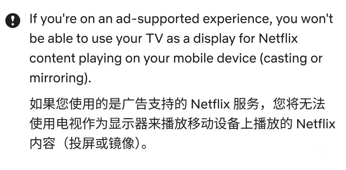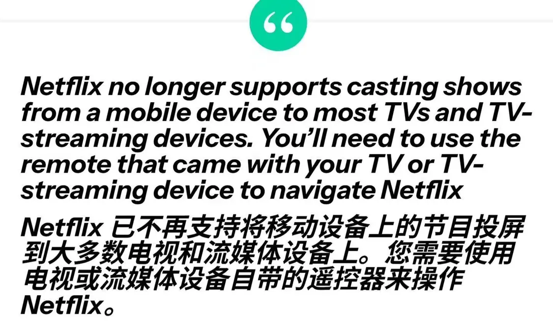 Netflix 目前已更新其官方支持页面,明确界定了新的操作规范,页面声明:“Netflix 不再支持从移动设备向大多数电视及电视流媒体设备投屏。”IT之家附上相关截图如下: