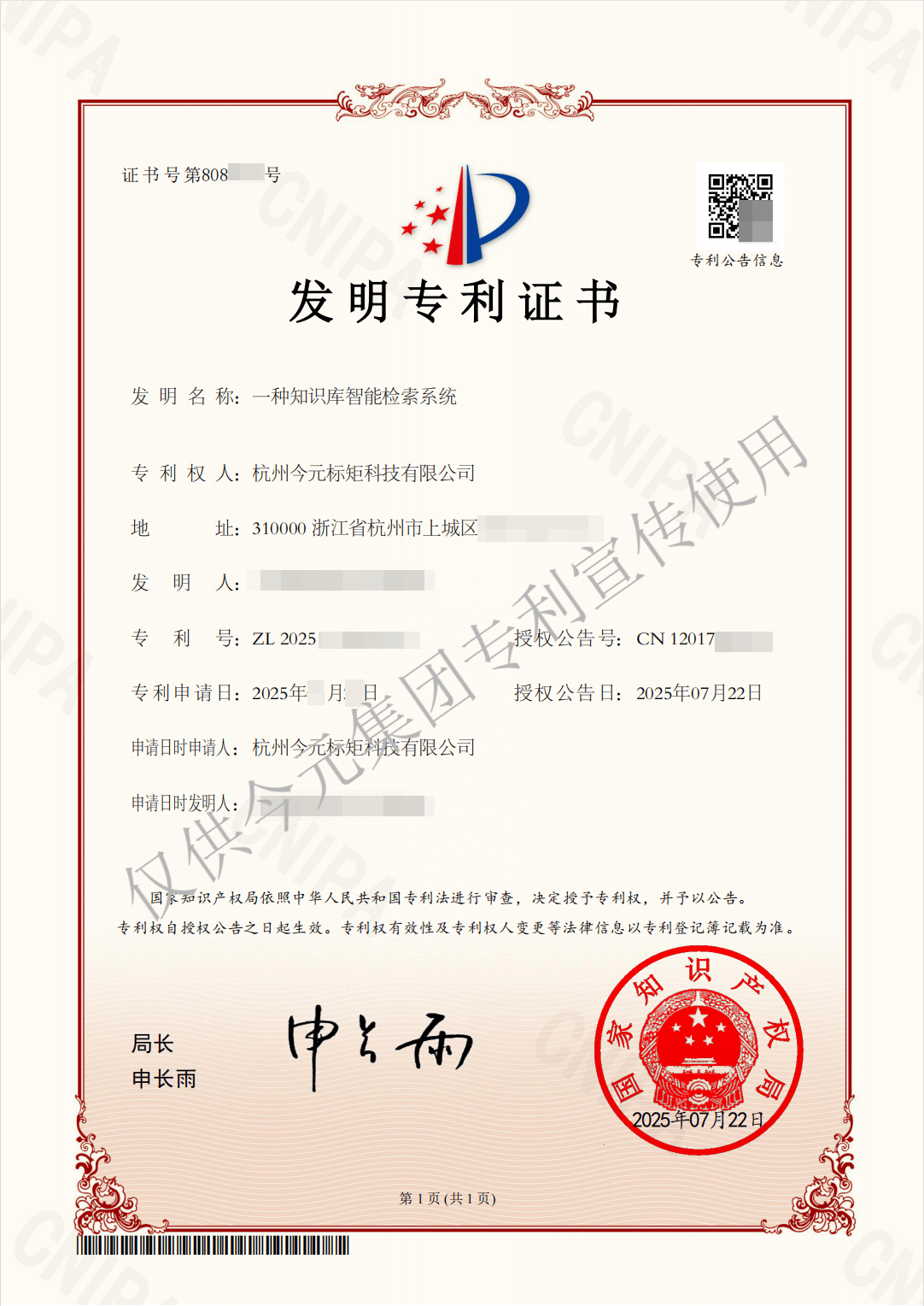 真正的创新,源于对底层技术的攻坚与重构。今元集团自研的“一种知识库智能检索系统”获得国家发明专利,为旗下生成式AI+HR SaaS产品注入更为坚实和敏锐的底层技术内核,赋能企业数字化管理迈向智能化新台阶,实现了技术创新与业务需求的精准匹配。