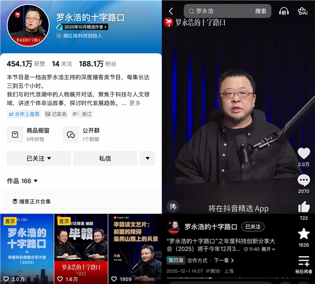 数据显示,“罗永浩的十字路口”上线抖音精选至今,完整版正片单集平均播放量突破600万,其中与“影视飓风”Tim的对谈,时长近3小时的正片视频播放量破900万,收获抖音网友点赞35.6万次。