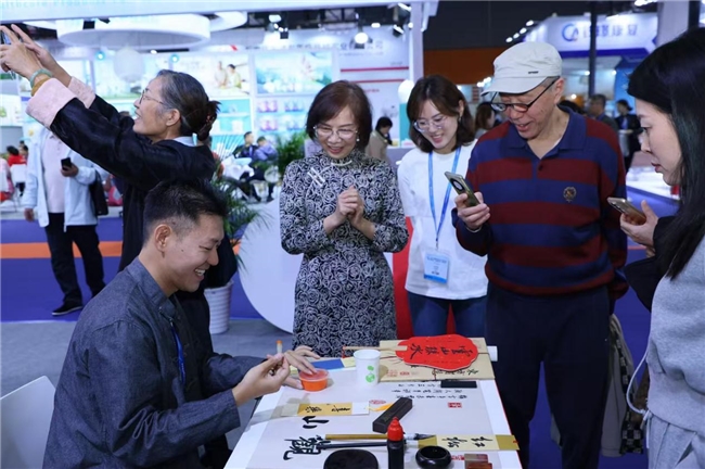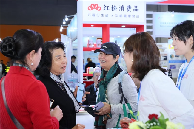 走进红松展区,仿佛踏入一个专为银发族打造的“兴趣乐园”。在书画互动区,红松小课的书法与国画老师现场创作、即时教学,吸引众多爱好者驻足交流与体验。此外,还有AI智能产品的互动展示,共同构成了一个沉浸式的兴趣探索空间。