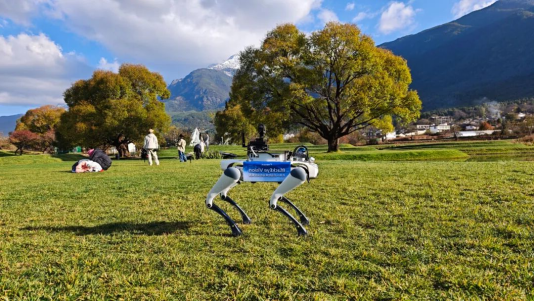 抬头、微微蹲下、转向,体验者的每一个动作指令都精准映射到机器狗身上,VR视野中的画面也随着机器狗的行动“移步换景”,远处的雪山,营地中的神树,纳西族的舞蹈依次呈现。天涯海角的热情与雪山之巅的清冽,在这一刻,于一方视野中悄然交融。