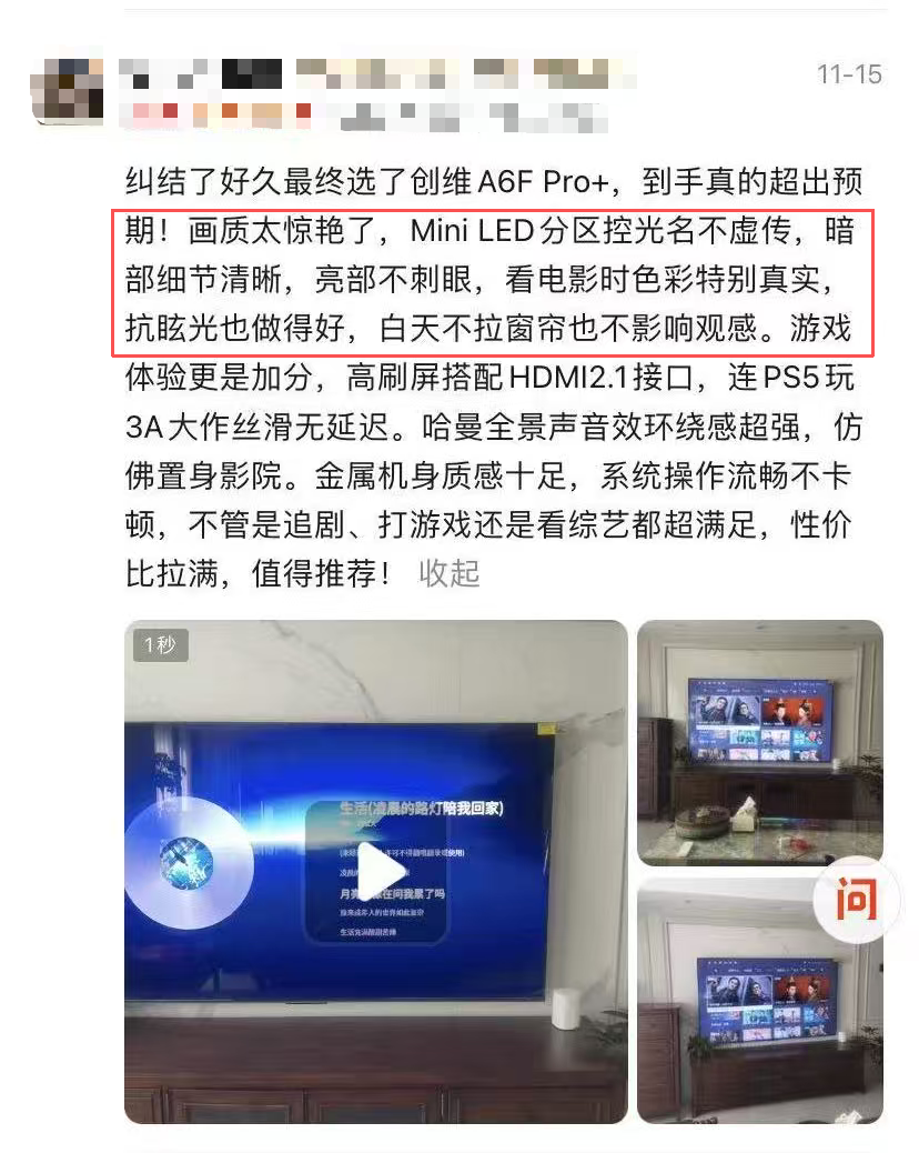 在创维6系产品积累的超万条用户评价中,画质表现成为最为集中的焦点。有用户直言其“它的画质锐利、性能超群,完全符合我对高端电视的所有期望”;另一位选择85英寸版本的用户则具体写道:“画质太惊艳了,Mini LED分区控光名不虚传,暗部细节清晰,亮部不刺眼,看电影时色彩特别真实,抗眩光也做得好,白天不拉窗帘也不影响观感。”这些真实反馈,共同勾勒出用户对卓越画质的定义:不仅是参数的堆砌,更是明暗、色彩与细节在真实场景中的综合呈现。