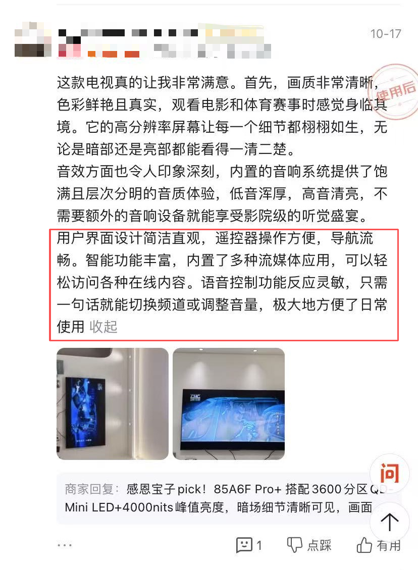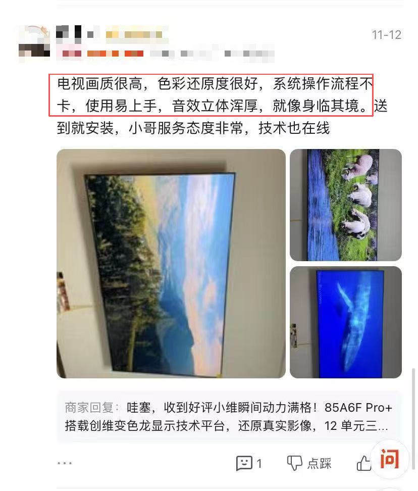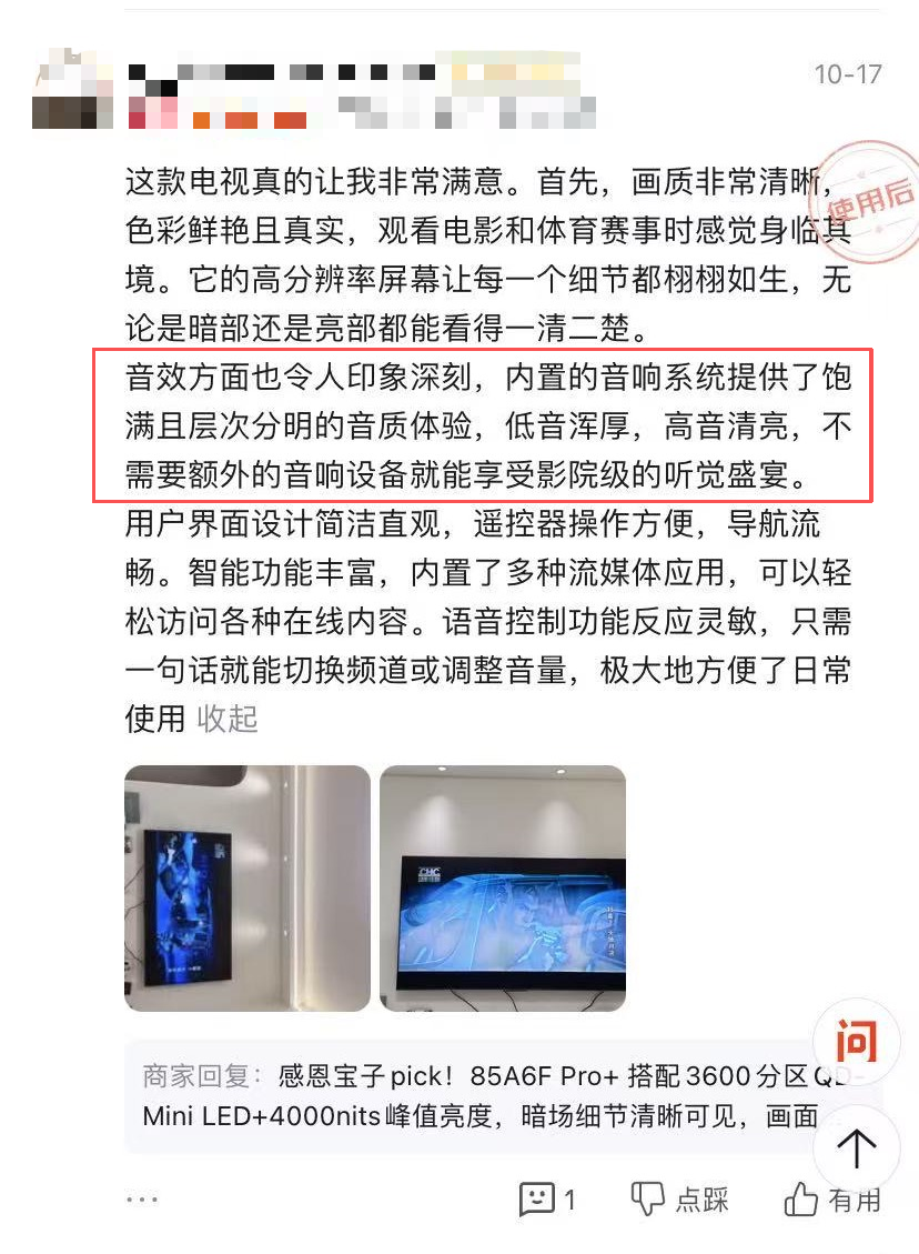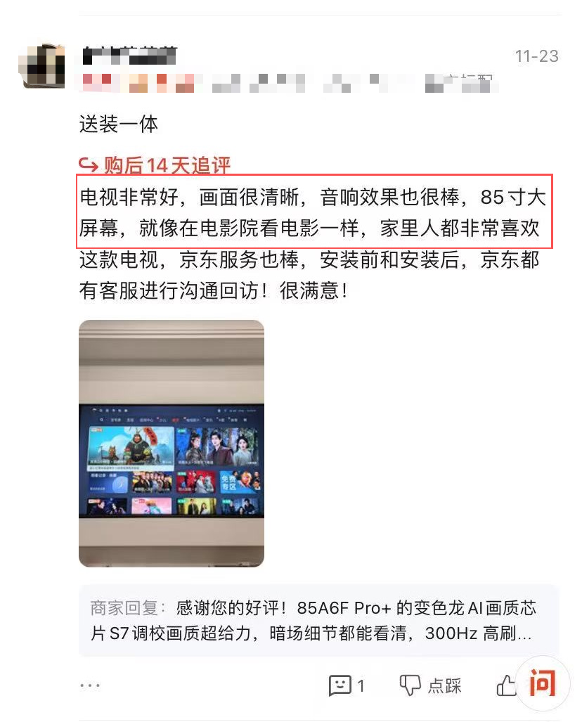 一位购买85寸机型的用户感叹:“音效方面令人印象深刻,低音浑厚,高音清亮,享受影院级的听觉盛宴。”另一位用户同样表示:“音响效果很棒,像在电影院看电影一样”。真实用户的反馈,印证了卓越音质在整体影音体验中不可或缺的价值。