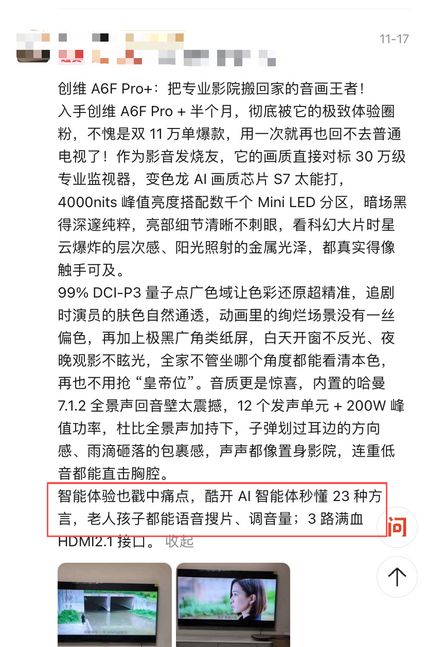 在系统层面,经典模式的简洁逻辑与个性化内容推荐的精准匹配,实现了“老少咸宜”的使用体验。多位用户特别提到“老人也很快上手”,印证了其界面设计的普适性。这种将强大性能转化为无形便捷的能力,与出色的音画质共同构成了完整的旗舰体验,让创维A6F Pro+真正成长为懂用户所需的家庭智能中枢。