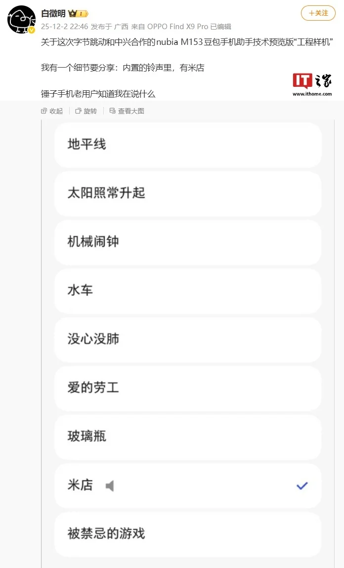 另外,博主 @白徵明 还发现,该机内置的铃声里有“米店”(IT之家注:铃声“米店”是锤子手机的内置手机铃声之一)。