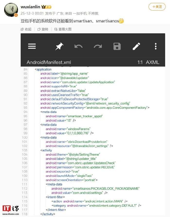 12 月 3 日消息,博主 @wuxianlin 今日分享了豆包手机的系统软件,发现了锤子科技遗留字样,称还能看到 smartisan、smartisanos。