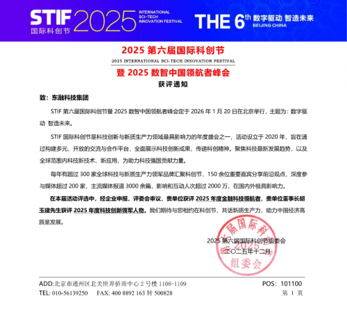 在第六届国际科创节的奖项评选过程中,东融的科技创新实力同样获得高度认可,荣获“2025年度金融科技领航者”奖项,董事长胡玉建先生也因其卓越的领导力与前瞻视野,被评为“2025年度科技创新领军人物”。