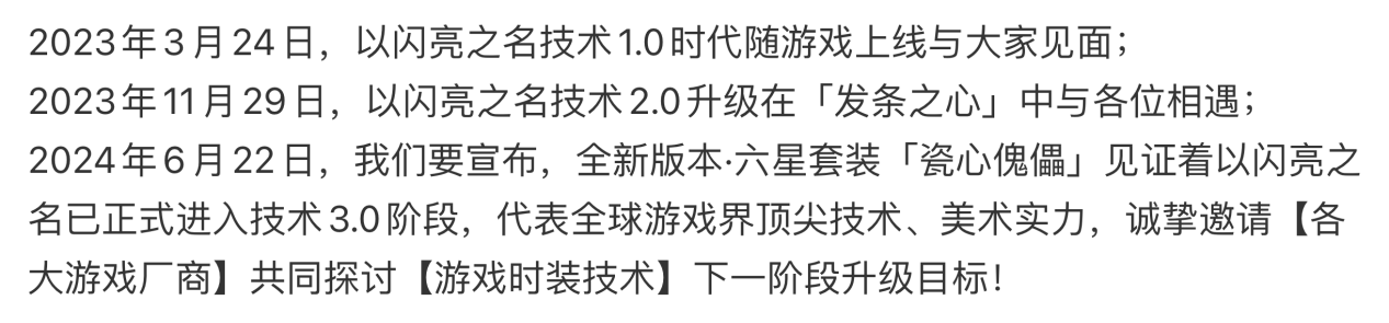 还有诸如“非遗联动女王”等玩家赠与《以闪亮之名》的美称,也将游戏的价值观:商业成功与社会价值的持续破圈展现得淋漓尽致。《以闪亮之名》的每一次更新、每一个动作,都在为更宏大的未来添砖加瓦,我们持续期待,未来惊喜会更多!