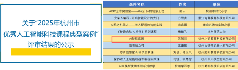 近日,由杭州市科协少年科技创新学会企业园区联合体组织开展的“2025年杭州市优秀人工智能科技课程典型案例征集活动”完成评审并进入公示阶段。由小码王(杭州小码教育科技有限公司)推送,吴慧菲老师及团队设计打造的《AI智能家居》课程案例,经专家组严格评审,成功入选“2025年杭州市优秀人工智能科技课程典型案例”。