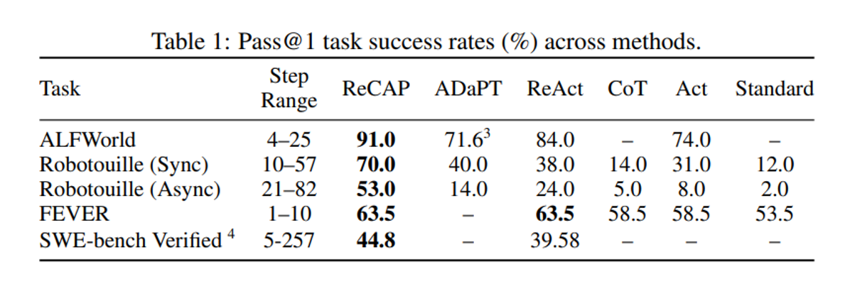 在严格遵循 pass@1(一次通过)的评测原则下,ReCAP在长序列具身任务Robotouille上相比ReAct基线取得了84.2%(同步)和112.5%(异步)的巨大性能提升。