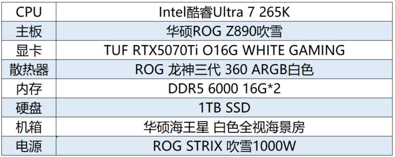 另一套白色主机是酷睿Ultra 200S平台。以华硕ROG Z890吹雪主板为核心,搭配Intel酷睿Ultra 7 265K处理器、华硕TUF RTX5070Ti O16G WHITE GAMING显卡等高性能硬件,给予玩家浑然一体的美学感受和超凡的游戏体验!