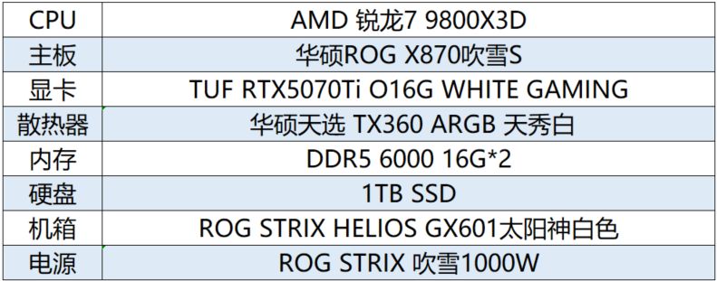 首先为大家推荐一套颜值与性能并存的锐龙9000电竞平台,以华硕ROG X870吹雪S主板为核心,搭配AMD锐龙7 9800X3D处理器、华硕TUF RTX5070Ti O16G WHITE GAMING显卡等令人心动的电竞装备,可高画质流畅运行各类大作,整机灯效也能带给用户无与伦比的沉浸式游戏体验!