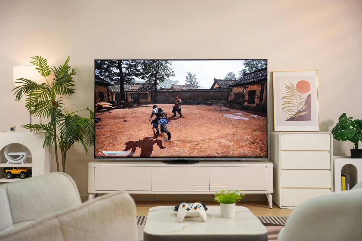 不止影视作品,多款优秀国产3A游戏业擅长“用色彩讲故事”。海信RGB-Mini LED电视通过搭载独家定制的黑曜屏Ultra,实现了“极黑极透”的深邃视效,配合信芯AI画质芯片H7的智能调控,暗场黑位精准、细节拉满媲美OLED,搭配4K 170Hz原生高刷,无论是高速运动赛事的流畅跟拍,还是3A游戏的毫秒级响应,都能做到丝滑无拖影、动态无模糊。值得一提的是,海信全新推出的RGB-Mini LED电视“影游机皇”E8S Pro,为影游发烧友带来SUPER电影模式、双杜比解码、语音启动游戏机、行业最强游戏妙控台等12项极致影游功能,既极致还原自然真实色彩,还能将看大片、玩游戏的氛围瞬间拉到顶点。现场,夏振东老师表示想买100吋大屏电视时,海信E8S Pro也是第一时间成为推荐的首选机型。
