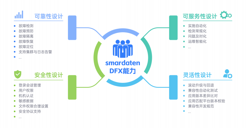 smardaten底层工程体系已完成了DFx相关工作,包含了高可用设计模式(如冗余、负载均衡)、内置的安全最佳实践(如数据加密、SQL注入防护)、以及性能优化技巧(如缓存策略、数据库索引)。