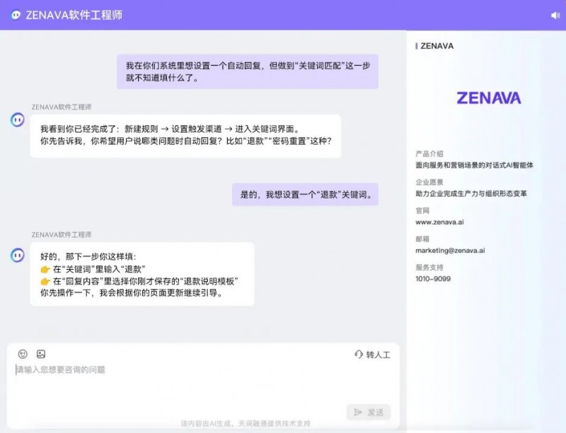 首先,在最基础的常规咨询场景中,ZENAVA能够承担起大量一线客服原本负责的工作。