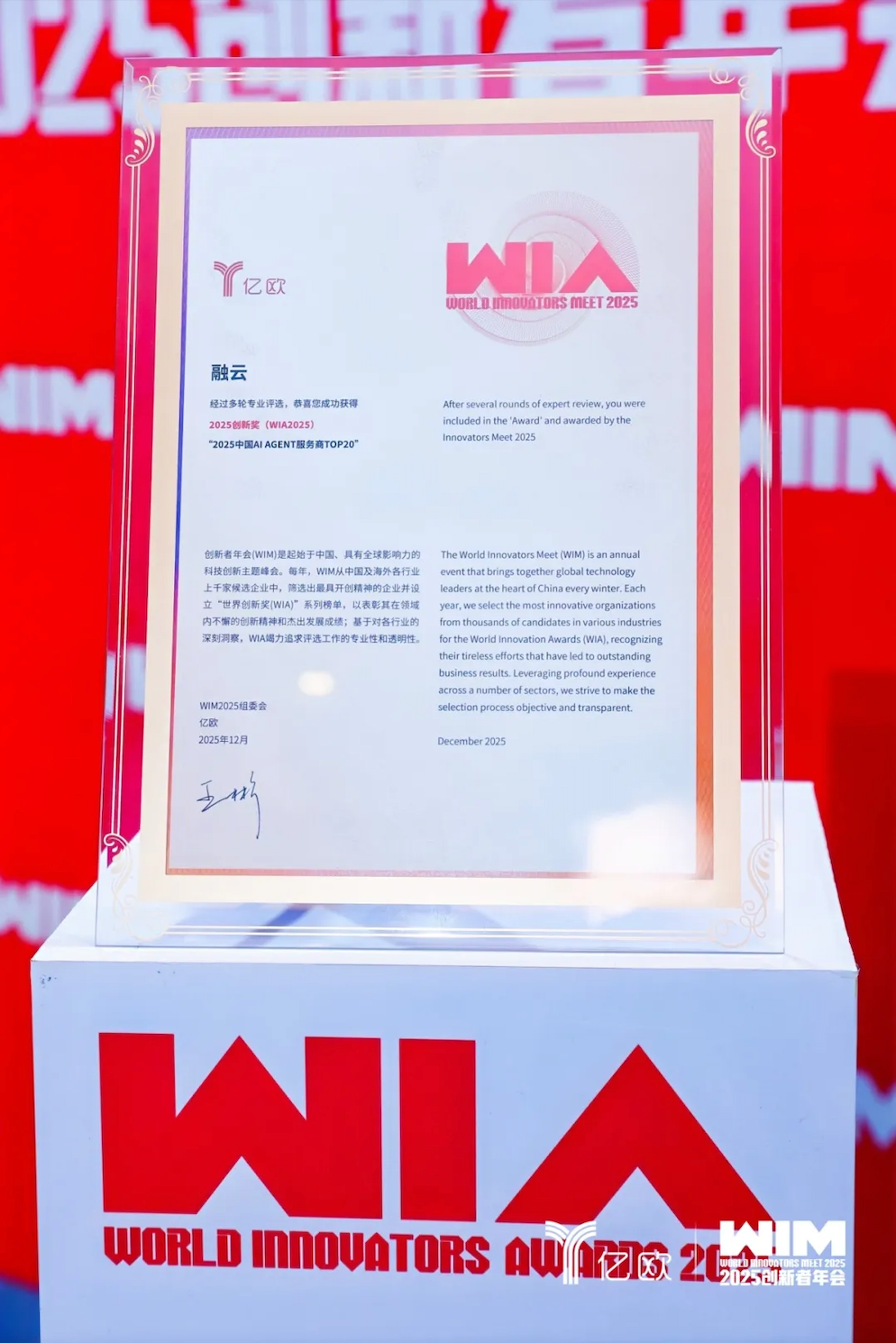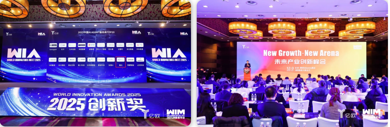 12 月 3 日,由亿欧主办的“WIM2025 创新者年会”在北京举行,大会发布“2025 创新奖”系列奖项,融云荣登“2025 中国 AI Agent 服务商 TOP20”。