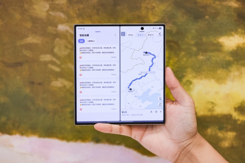 智能收藏与智能拖放等功能的加入,使手机中的内容得以轻松整理,甚至还可以联动地图为旅行或活动生成规划路线,真正让大屏价值落到日常操作中。即时简报功能可以整合天气、日程、健康数据、热点新闻等内容,并通过个性化的推送,让用户可以时刻掌控关键信息。无论是移动办公,还是日常生活,三星Galaxy Z Fold7都堪当“可折叠的随身工作台”。