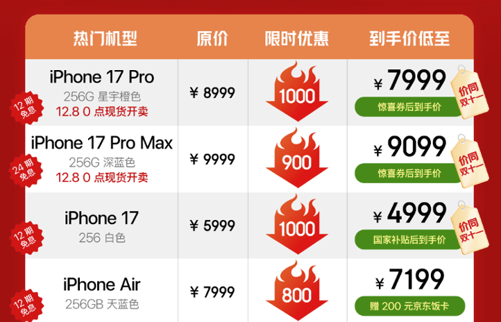 具体来看,256G 版 iPhone 17 Pro 领 300 元惊喜券,以旧换新补贴 700 元起,到手价低至 7999 元;256G 版 iPhone 17 Pro Max 领 300 元惊喜券,以旧换新补贴 600 元起,到手价低至 9099 元;256G 版 iPhone 17 部分地区可领 500 元国家补贴,以旧换新补贴 500 元起,到手价 4999 元;iPhone Air 256G 版下单送 200 元京东饭卡,以旧换新补贴 800 起,到手价 7199 元起。值的一提的是,以上手机支持至高 24 期免息,让大家都能轻松换新。