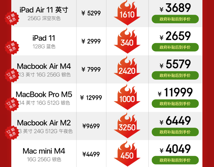 对于希望在年末升级装备的消费者,京东 12.12 为 MacBook 带来限时直降、10% 政府补贴、以旧换新再补 300 元起等多重福利。其中,13 英寸 MacBook Air M4(10+8 核)16+256G 版,限时直降 1800 元,国家补贴 10%,以旧换新补贴 300 元起,到手价低至 5579 元;13.6 英寸 MacBook Air M2(8+10 核) 24+512G 版限时直降 3250 元,到手价 6449 元;2025 年款 MacBook Pro 14 英寸 M5(10+10 核)16+512G 版,政府补贴 1000 元,到手价 11999 元。