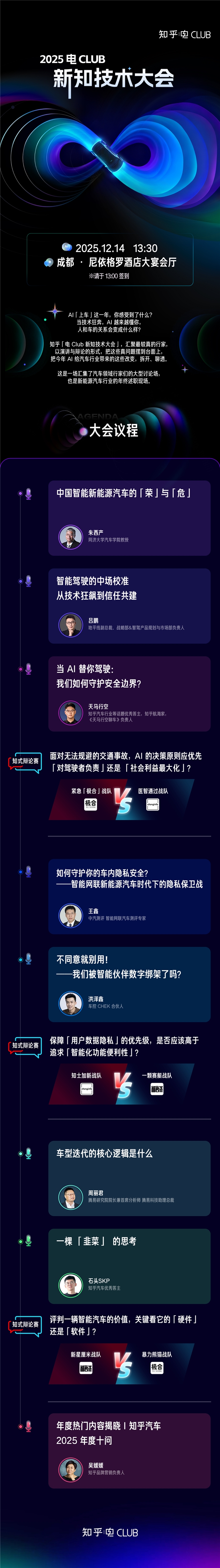 新能源汽车发展充斥着最尖端、前沿的技术创新,而当下新能源汽车行业中最专业、最深度、最值得信赖的讨论和内容,正在非常高频地发生在知乎。作为创新产业和新崛起消费市场,新能源汽车更仰赖专业内容的普及。这也是知乎举办电Club新知技术大会的初衷,通过可信赖的专业讨论和分享,为市场创新和消费提供价值。12月14—15日,知乎2025电Club新知技术大会,敬请期待。