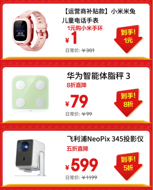 更有运营商补贴款小米米兔儿童电话手表1元抢;华为智能体脂称 3 直降至79元;飞利浦 Neo Pix 345 投影仪五折优惠到手仅599元。