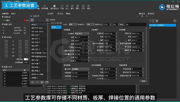 SpeedWeld软件的工艺参数库可存储不同材质、板厚、焊接位置对应的通用参数、焊枪姿态、引收弧参数、断焊参数及多层多道参数等。