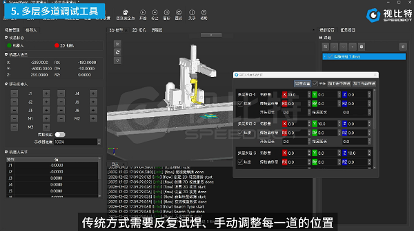 兼容发那科、库卡等主流机器人,无需开放底层EtherCAT总线协议及额外控制器,配置特定程序后即可与SpeedWeld软件即插即用;搭配软件内置的多层多道调试工具,可灵活便捷地调整每一层道的焊接轨迹和参数,将原本耗时数小时的手动排道工作,缩短至几十分钟内完成。