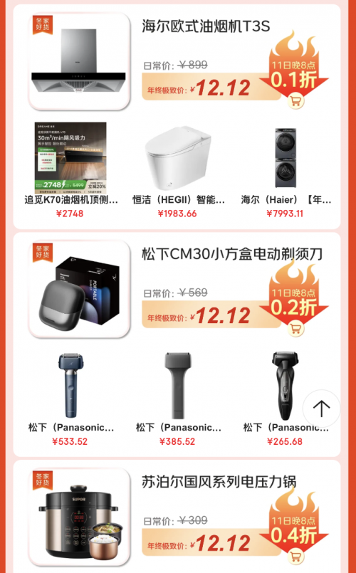 厨房方寸之间,却承载着生活的烟火气与家的温情。海尔欧式油烟机T3S凭借420Pa超大风压和20m³/min大吸力,能在爆炒瞬间迅速吸净油烟;苏泊尔国风系列电压力锅通过双胆配置满足炖煮煲汤等多种需求,锁住营养与原香,以上两款好物在12月11日晚8点只要12.12元。苏泊尔一机四用智能炒菜机器人,堪称厨房新手的“私人厨师”;美菱风冷一级三门冰箱则以其大容量、精细分储和长效保鲜技术,成为家庭食材健康的“守护站”,这两款好物在12月11日晚8点,将以1212元的惊爆价进行限量抢购。