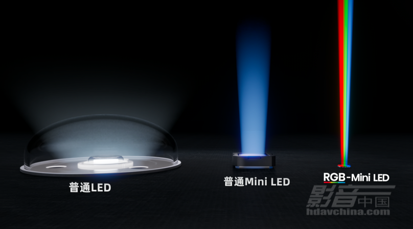RGB-Mini LED与普通Mini LED、普通LED背光示意图