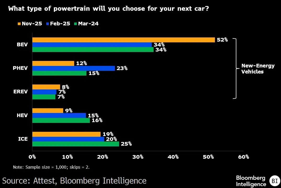 尽管中国已是全球最大的电动汽车市场,但消费者对续航焦虑及电池在寒冷天气下性能表现的担忧依然存在。不过,调查指出,更智能的电动汽车技术、更低的维护成本,以及高压平台的广泛应用(可显著提升充电速度)正持续吸引消费者转向电动汽车。