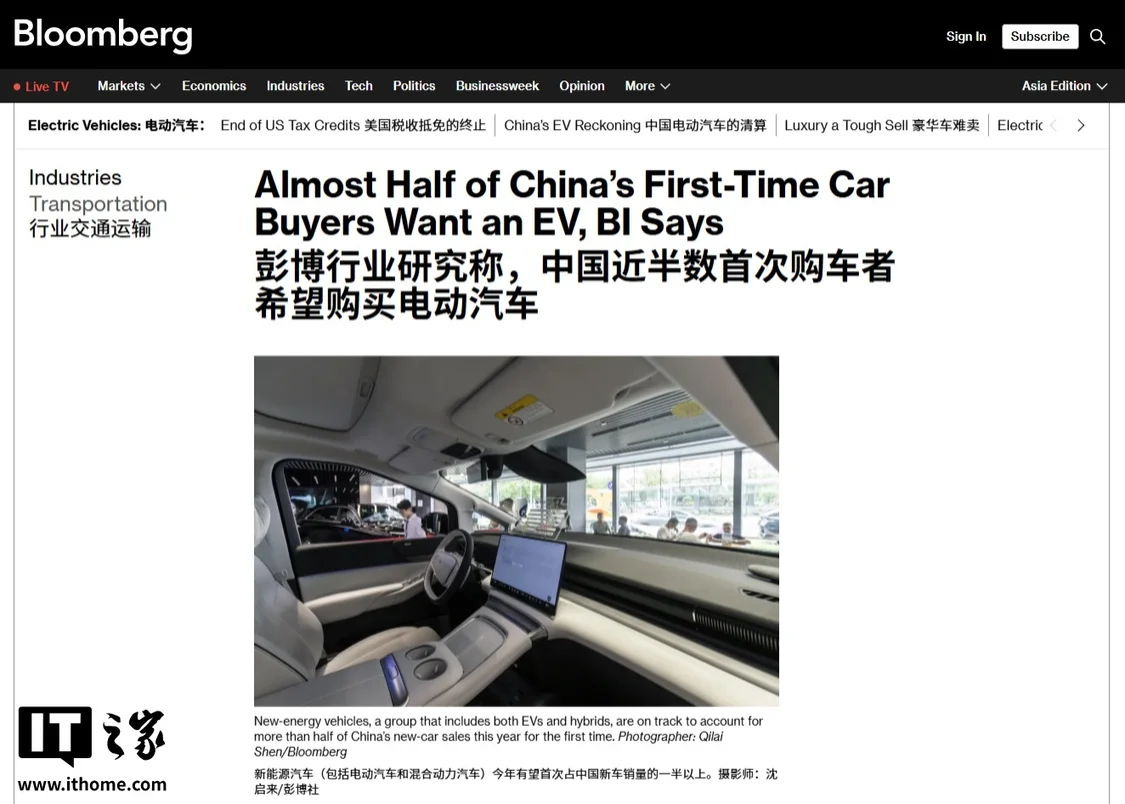 12 月 10 日消息,根据彭博情报(Bloomberg Intelligence)的一项调查显示,越来越多的中国首次购车者倾向于选择电动汽车,而非其他动力系统车型,主要原因在于其价格实惠、车型选择丰富以及充电便利性显著提升。