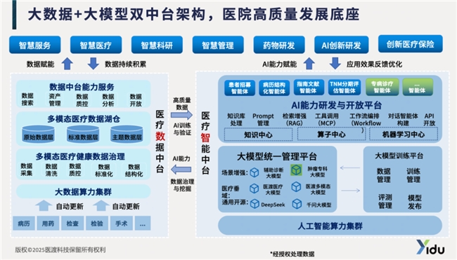 为此,医渡科技打造了“大数据+大模型”双中台解决方案,为医院打造高质量发展的坚实数字底座,系统性地破解“数据整合复杂、多模型管理难、工具与知识分离、智能应用与业务脱节”等转型难题。