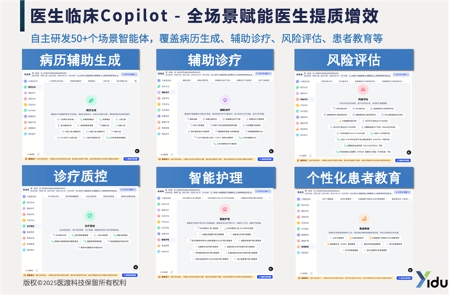 实现“轻量化、场景化”的无缝嵌入。智能体应融入医生与患者的自然工作流。医渡科技推出的 “医生临床Copilot” ,以插件形式嵌入医生工作站,可自动调取当前患者数据,让医生在书写病历时、制定方案中随时唤起AI辅助,实现“所想即所得”的丝滑体验。目前,医渡科技已经完成了50+个场景智能体的深度打磨。