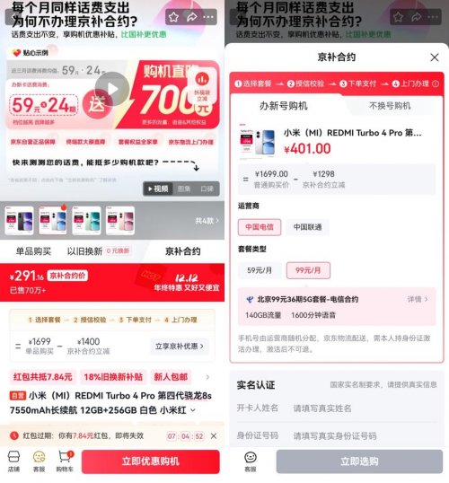 职场新人急需办理新的流量卡,并有换新手机想法,可用“京补合约”购买iQOO Z10 Turbo+、REDMI Turbo 4 Pro、OPPO Reno14 Pro等优质手机,同时办理了一张号卡及超值套餐。以北京用户通过“京补合约”入手REDMI Turbo 4 Pro 12GB+256GB为例,办理当地电信99元36期套餐,享京补合约立减1298元,到手价401元,套餐含140GB流量和1600分钟语音,职场新人不仅可以优惠换新,还能得到合适的套餐,及一张工作号卡或流量卡。