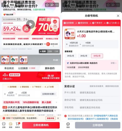 对于需要给孩子购买儿童手表的宝妈来说,通过“京补合约”入手正合适。其中,小天才儿童电话手表Q3,以北京为例,办理当地电信59元24期套餐,可享京补合约立减508元,到手价1元,套餐含10GB流量和200分钟语音,以优惠价格购入儿童手表的同时也为孩子办理一张号卡。